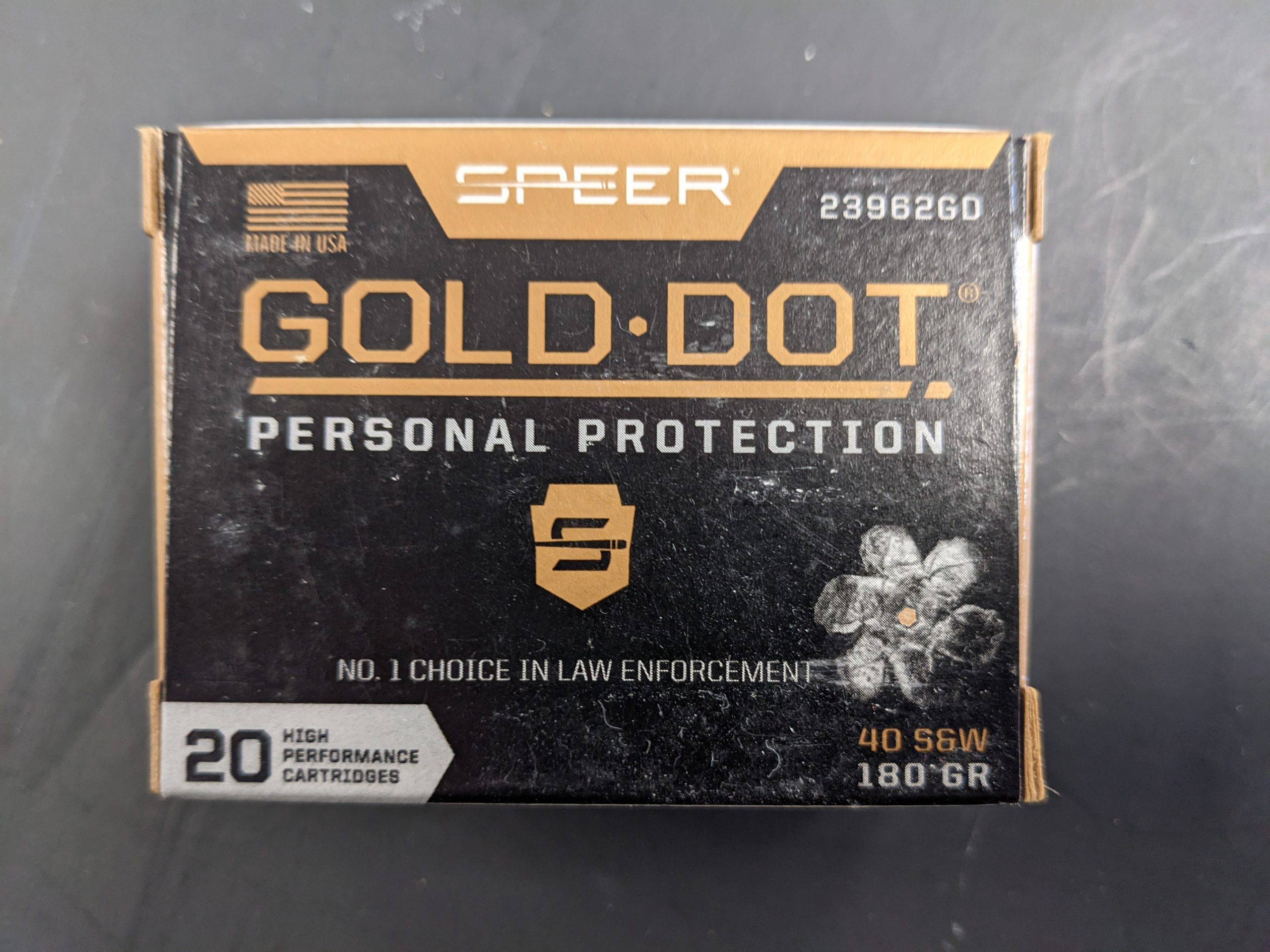 Speer Gold Dot 40 S&W 180GR JHP Speer Gold Dot 40 S&W 180GR JHP Item Description Speer Gold Dot 40 S&W 180 grain Jacketed Hollow Point, 20 rounds Fiocchi 308 Winchester 150GR FMJ BT CCI CB 22 Long 29GR LRN << return to inventory
